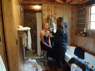 Then it was off to the cabins to begin hair and make-up. Anna and I cuddled in the bed to get warm:
